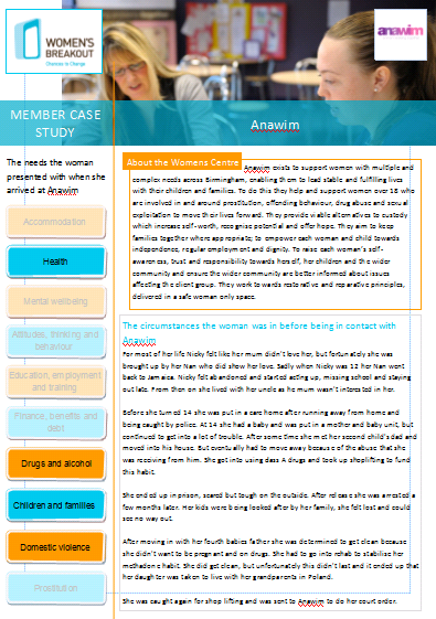 Anawim exists to support women with multiple and complex needs across Birmingham, enabling them to lead stable and fulfilling lives with their children and families. To do this they help and support women over 18 who are involved in and around prostitution, offending behaviour, drug abuse and sexual exploitation to move their lives forward. They provide viable alternatives to custody which increase self-worth, recognise potential and offer hope. They aim to keep families together where appropriate; to empower each woman and child towards independence, regular employment and dignity. To raise each woman’s self-awareness, trust and responsibility towards herself, her children and the wider community and ensure the wider community are better informed about issues affecting the client group. They work towards restorative and reparative principles, delivered in a safe woman only space. Anawim believes that women should be encouraged to exercise genuine choice, enabling them to access services appropriate to their unique requirements.
